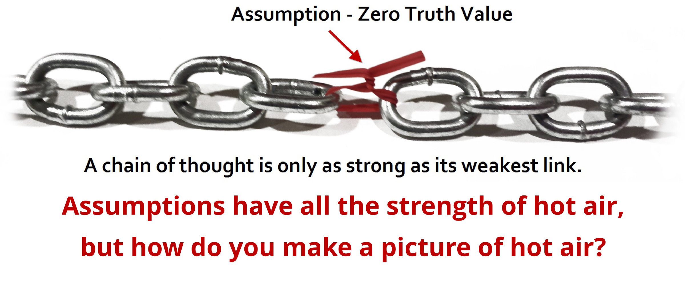 We can picture a chain with one link replaced by a twist-tie like we use to close a bag of bread. However, it’s an inaccurate picture since the twist-tie represents a single assumption, but twist-ties are infinitely stronger than assumptions. Assumptions have all the strength of hot air, but how do you make a picture of hot air?