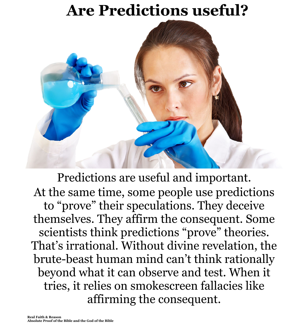 Predictions are useful and important. For example, we predict turning the steering wheel will have an expected effect on the direction the car is going, so we steer the car. As another example, we predict working hard will increase the odds of making progress toward our goals, so we work hard. As another case in point, we predict injuring ourselves will cause pain, so we avoid injuring ourselves. So, from these examples, we can see we take many actions based on predictions. At the same time, some people use predictions to “prove” their speculations. They deceive themselves. They affirm the consequent. Some scientists think predictions “prove” theories. That’s irrational. Without divine revelation, the brute-beast human mind can’t think rationally beyond what it can observe and test. When it tries, it relies on smokescreen fallacies like affirming the consequent.