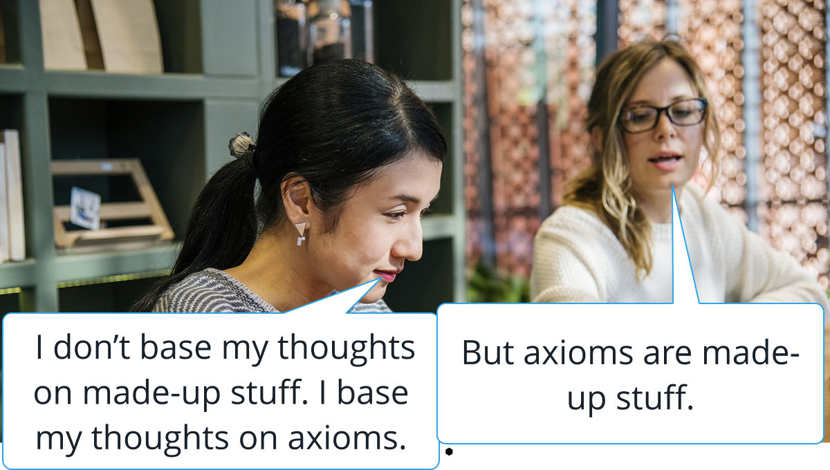 Sandy Sandbuilder: I don’t base my thoughts on made-up stuff. I base my thoughts on axioms. Axioms are obvious facts that don’t require proof. They aren’t made-up stuff.