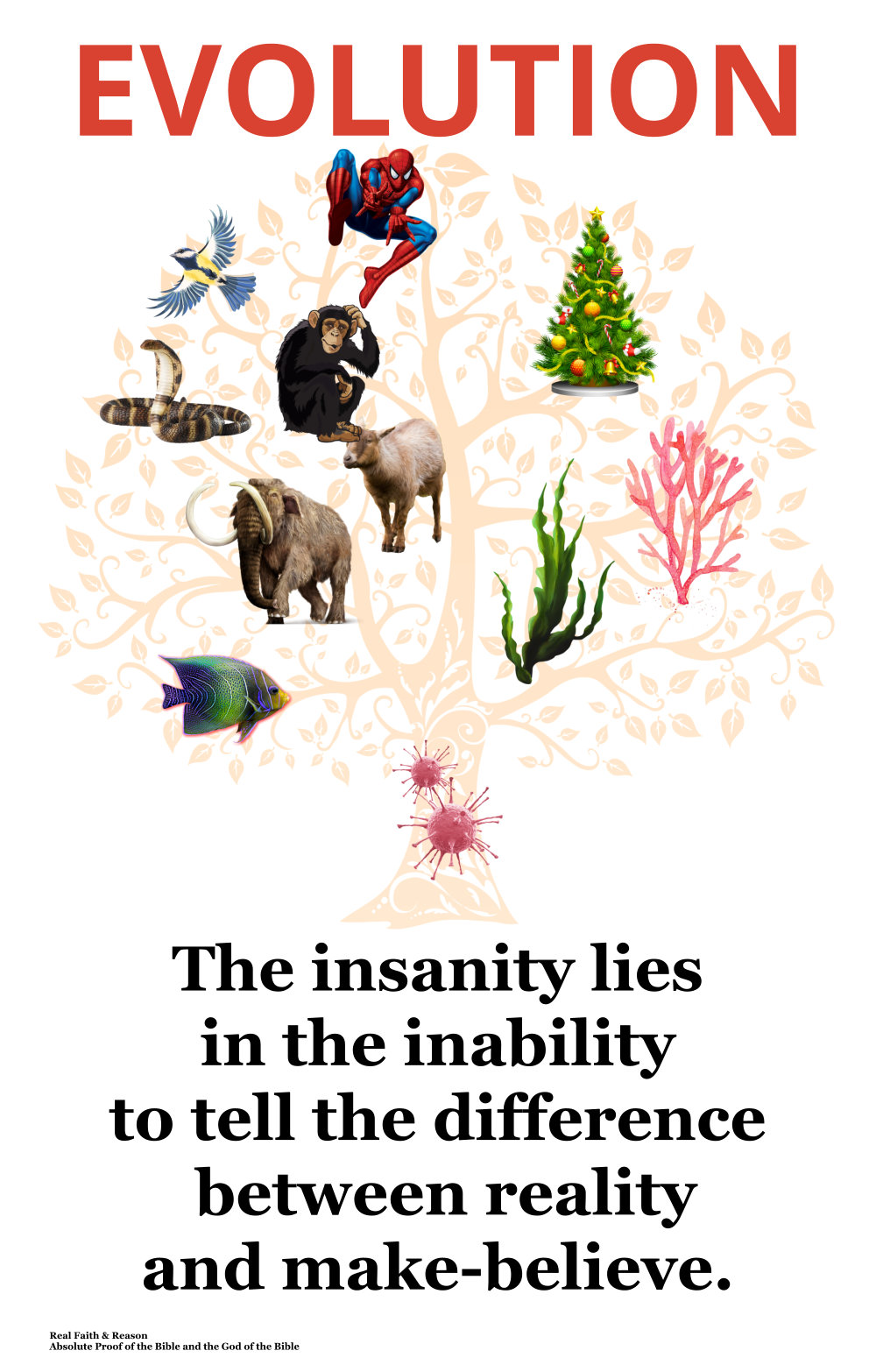 When evolutionists define the word “evolution” too broadly, the broad definition makes it hard to tell the difference between reality and imagination. Made-up stories aren’t part of reality, but the broad definition blurs this distinction. The insanity lies in the inability to tell the difference between reality and make-believe.