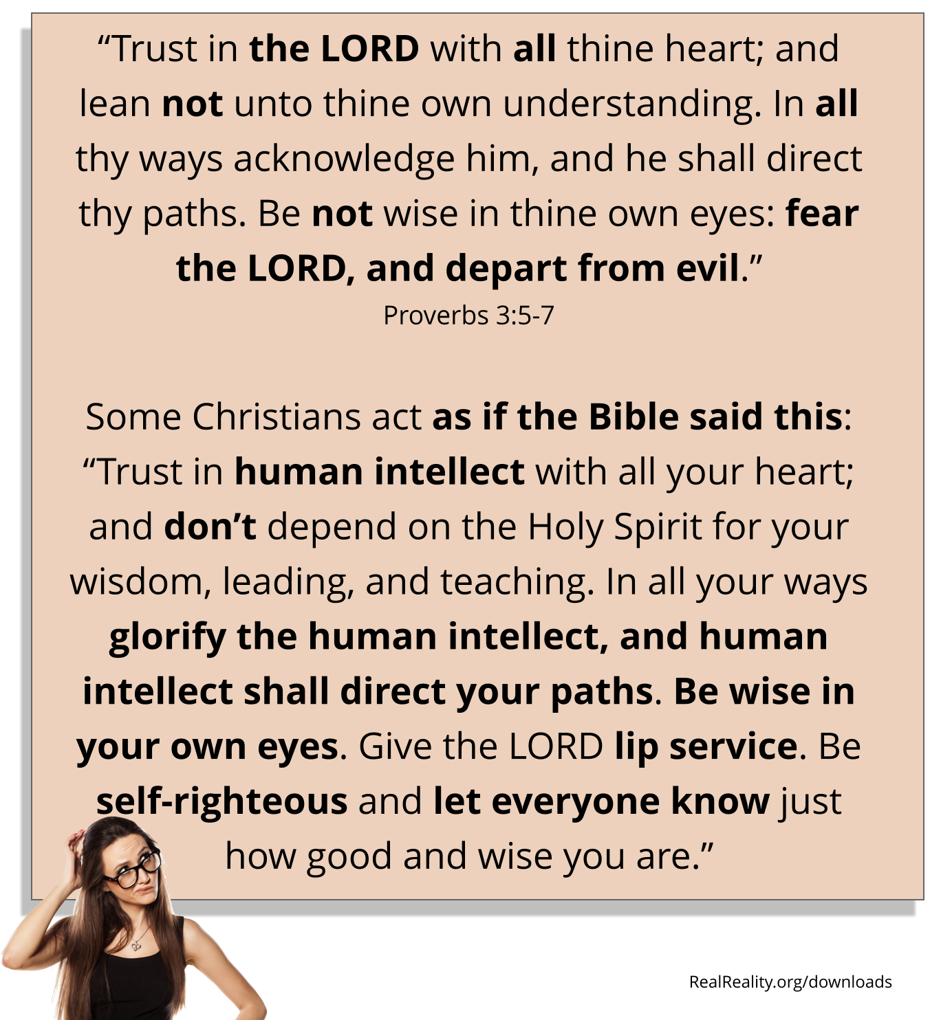 “Trust in human intellect with all your heart; and don’t depend on the Holy Spirit for your wisdom, leading, and teaching. In all your ways glorify the human intellect, and human intellect shall direct your paths. Be wise in your own eyes. Give the LORD lip service. Be self-righteous and let everyone know just how good and wise you are.”