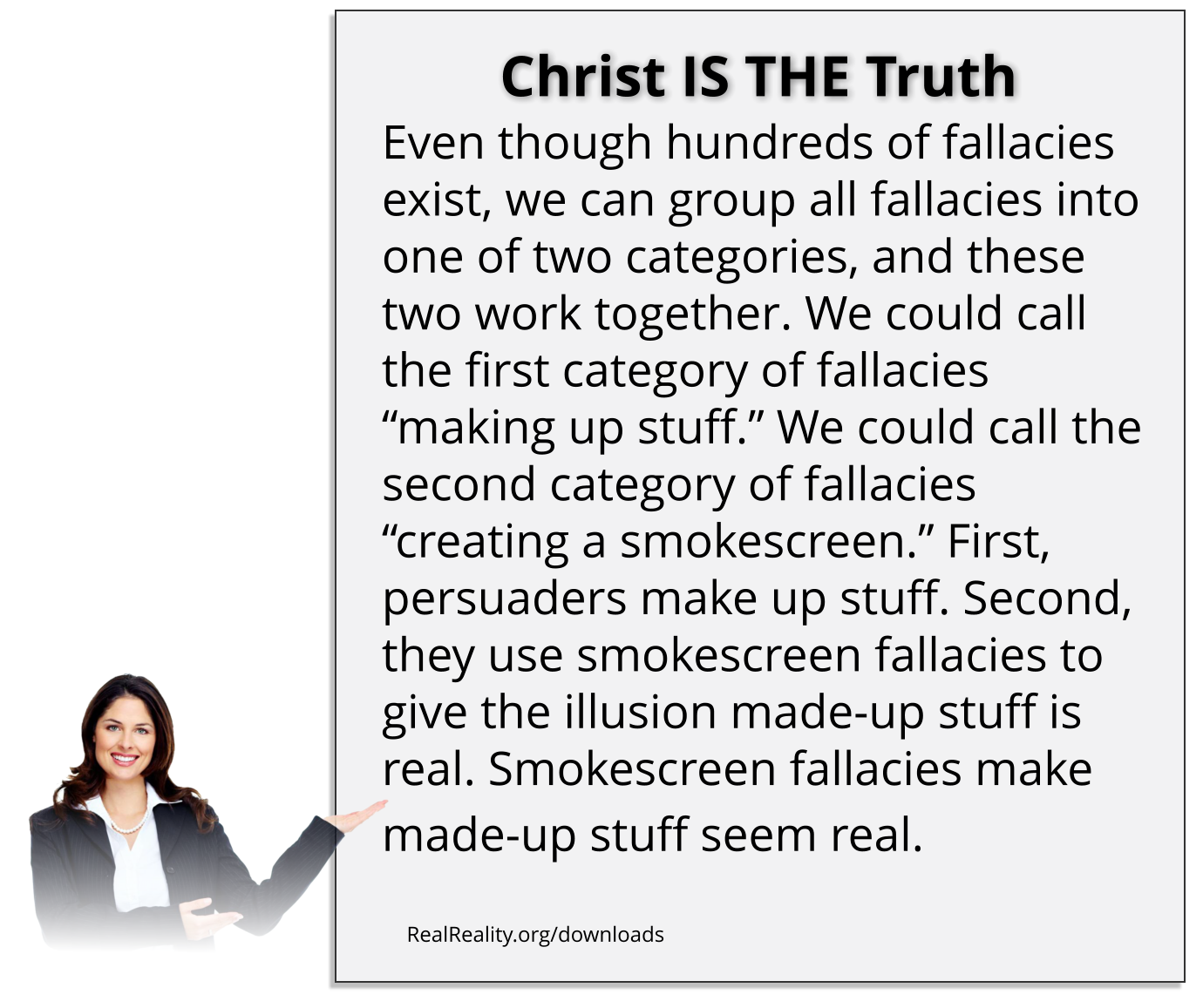 Even though hundreds of fallacies exist, we can group all fallacies into one of two categories, and these two work together. We could call the first category of fallacies “making up stuff.” We could call the second category of fallacies “creating a smokescreen.” First, persuaders make up stuff. Second, they use smokescreen fallacies to give the illusion made-up stuff is real. Smokescreen fallacies make made-up stuff seem real.