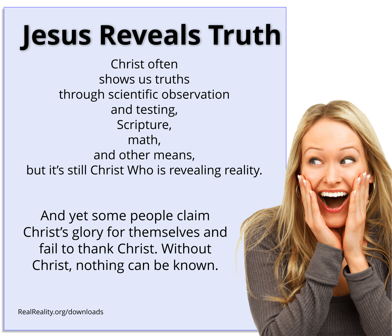 Scholars tell us about various methods by which we supposedly can “know” about reality. Most of the methods intellectuals propose for finding the truth actually deceive us. Christ often shows us truths through scientific observation and testing, Scripture, math, and other means, but it’s still Christ Who is revealing reality. And yet some people claim Christ’s glory for themselves and fail to thank Christ. Without Christ, we can know nothing. Our minds can even misinterpret the Bible if our minds aren’t depending on the Holy Spirit. How much more do we misinterpret scientific observations when our interpretations depend on made-up stuff (assumptions, axioms, or preconceptions)?