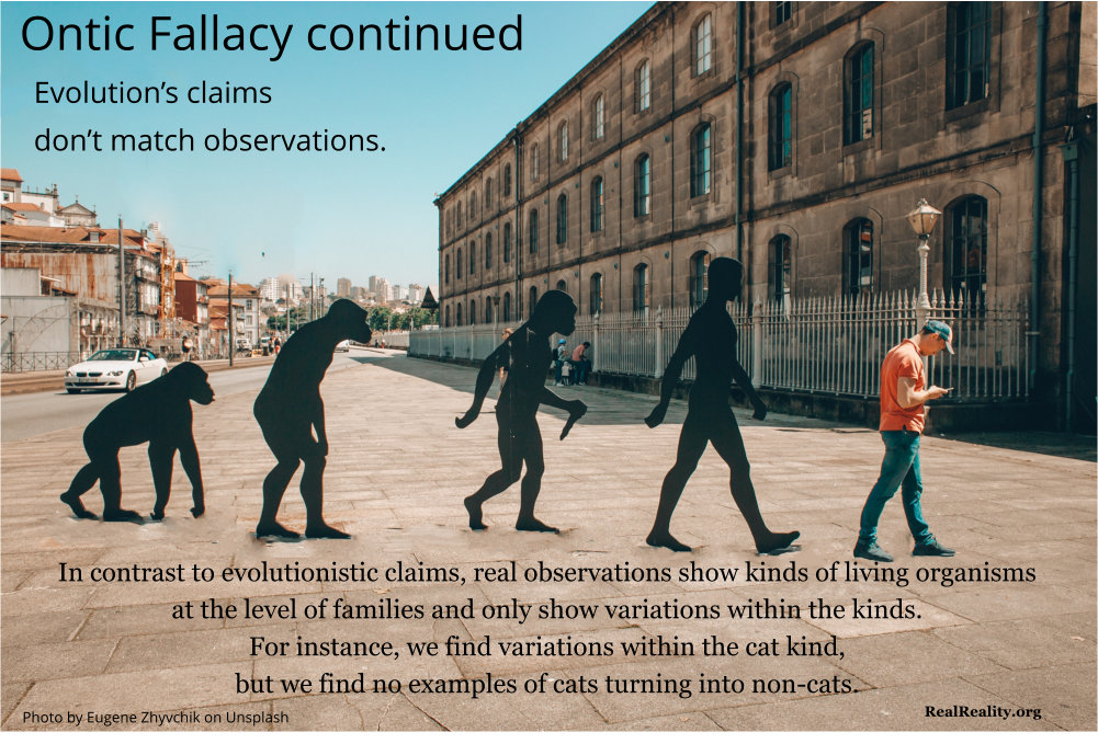 In contrast to evolutionistic claims, real observations show kinds of living organisms at the level of families and only show variations within the kinds. For instance, we find variations within the cat kind, but we find no examples of cats turning into non-cats. And yet some people think they see ontological evidence for these stories about supposed past events when they only see a vision that comes out of their own deceitful minds.