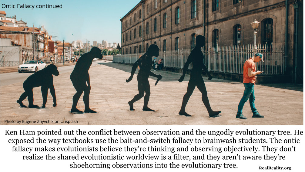 Ken Ham pointed out the conflict between observation and the ungodly evolutionary tree. He exposed the way textbooks use the bait-and-switch fallacy to brainwash students. The ontic fallacy makes evolutionists believe they’re thinking and observing objectively. They don’t realize the shared evolutionistic worldview is a filter, and they aren’t aware they’re shoehorning observations into the evolutionary tree.