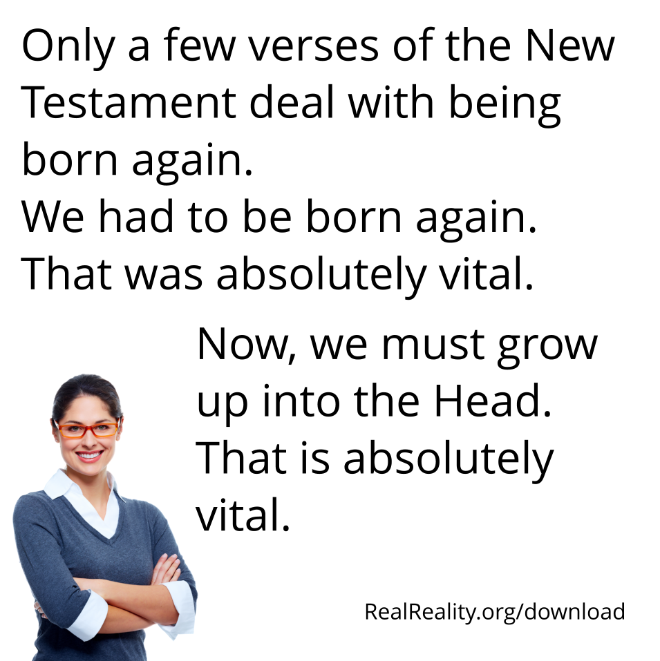 We’re born again. That part was easy. Growing up is another matter. Most of the New Testament is about growing up. Only a few verses of the New Testament deal with being born again. We had to be born again. That was absolutely vital. Now, we must grow up into the Head. That is absolutely vital.