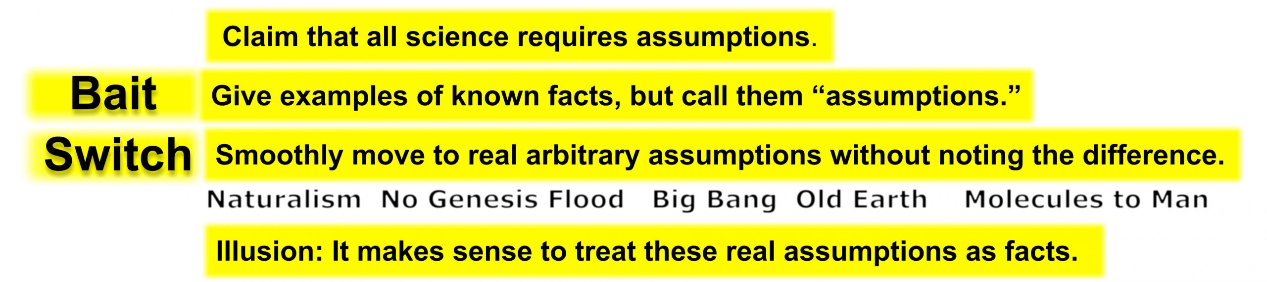 - Then they also call untestable statements “assumptions.” They introduce real, off-the-wall assumptions. For instance, they assume naturalism, materialism, and uniformitarianism.