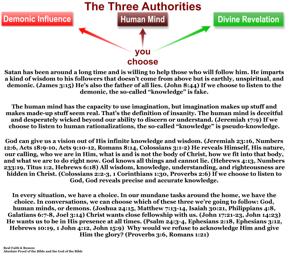 In every situation, we have a choice. In our mundane tasks around the home, we have the choice. In conversations, we can choose which of these three we’re going to follow: God, human minds, or demons. (Joshua 24:15, Matthew 7:13-14, Isaiah 30:21, Philippians 4:8, Galatians 6:7-8, Joel 3:14) Christ wants close fellowship with us. (John 17:21-23, John 14:23) He wants us to be in His presence at all times. (Psalm 24:3-4, Ephesians 2:18, Ephesians 3:12, Hebrews 10:19, 1 John 4:12, John 15:9) Why would we refuse to acknowledge Him and give Him the glory? (Proverbs 3:6, Romans 1:21)