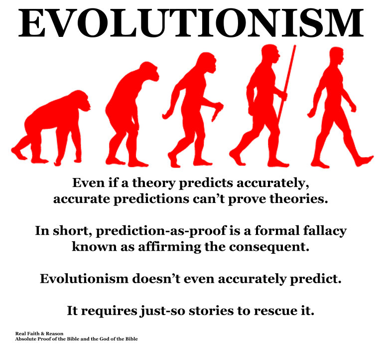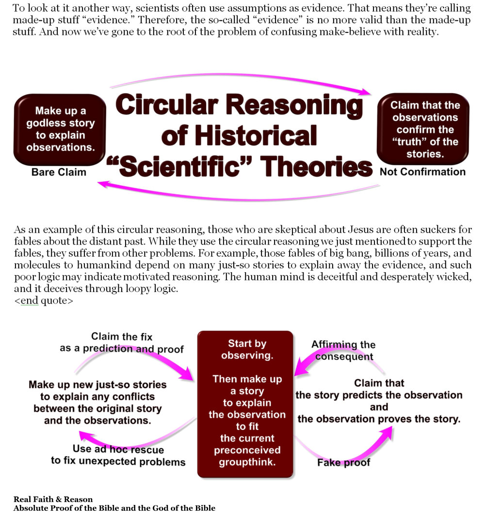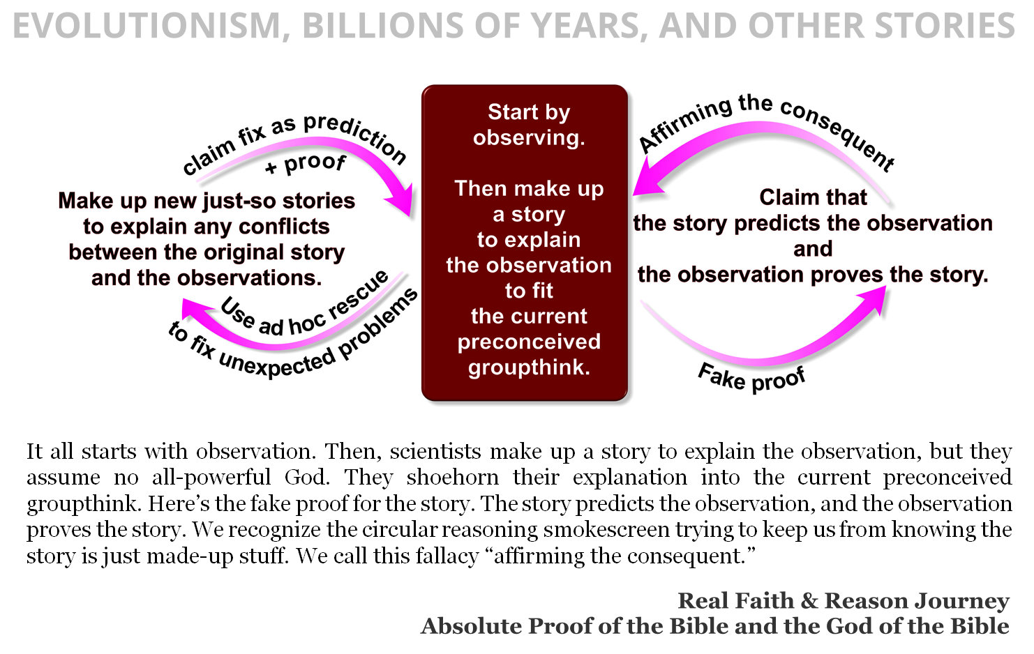 It all starts with observation. Then, scientists make up a story to explain the observation, but they assume no all-powerful God. They shoehorn their explanation into the current preconceived groupthink. Here’s the fake proof for the story. The story predicts the observation, and the observation proves the story. We recognize the circular reasoning smokescreen trying to keep us from knowing the story is just made-up stuff. We call this fallacy “affirming the consequent.”