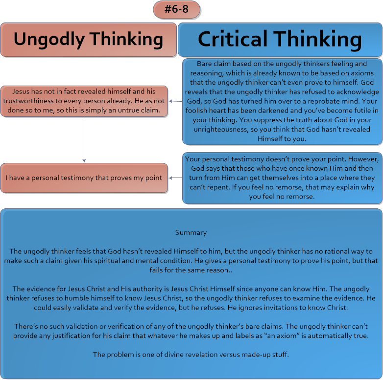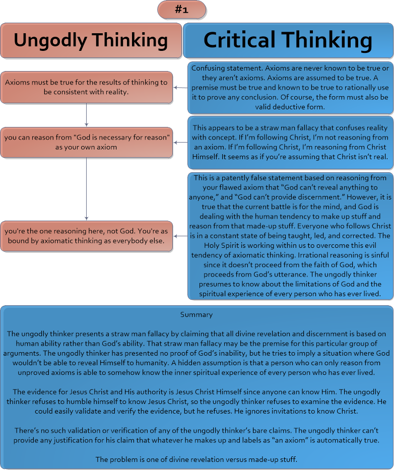 However, ungodly thinkers have no way to have a starting point that’s true. Each time they come up with something that they think is true, they have to come up with a reason that they think it’s true. So they look for something that’s true to prove whatever they claimed was true. They end up in an infinite regression of unproved proofs. They can’t escape this, so they use axioms. Axioms are claims that they make up and believe to be true without proof. They do this very cleverly, so it seems to make sense unless we really press them. When we press them, we find that they’re very hard to pin down. Once we pin them down, they’ll finally admit that they’re making the whole thing up, but then they’ll accuse us of having their same problem.