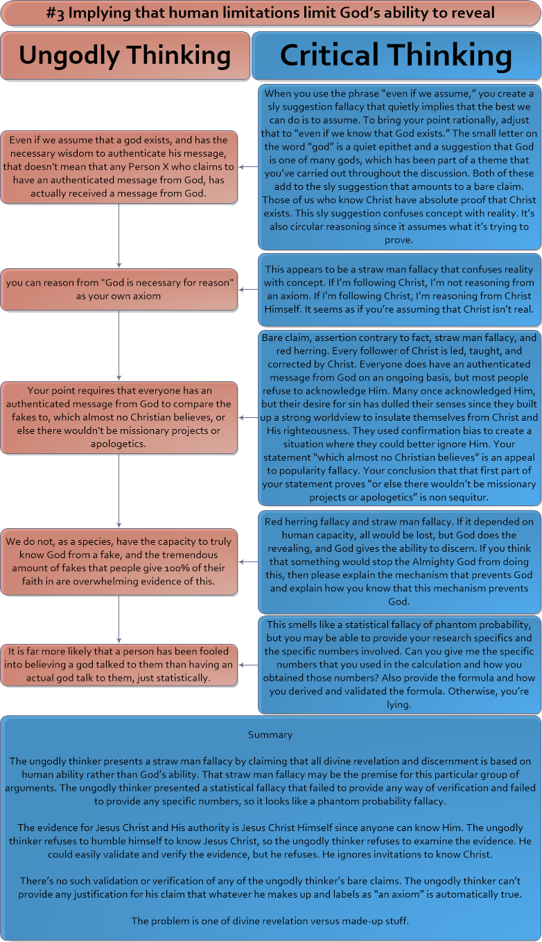 The ungodly thinker will then argue that his or her reasoning is based on a true premise—that the ungodly thinker can self-generate true premises from nothing. This argument can take many forms, but it’s always a defense of the ungodly thinker’s made-up stuff. At the same time, while basing all thinking on made-up stuff, the ungodly thinker will claim to know that no follower of Christ can really hear Christ’s voice. This argument usually goes to the point of claiming that, because of human weakness, God can’t possibly communicate with human beings in a meaningful way. Of course, the ungodly thinker is basing this entire argument on made-up stuff.