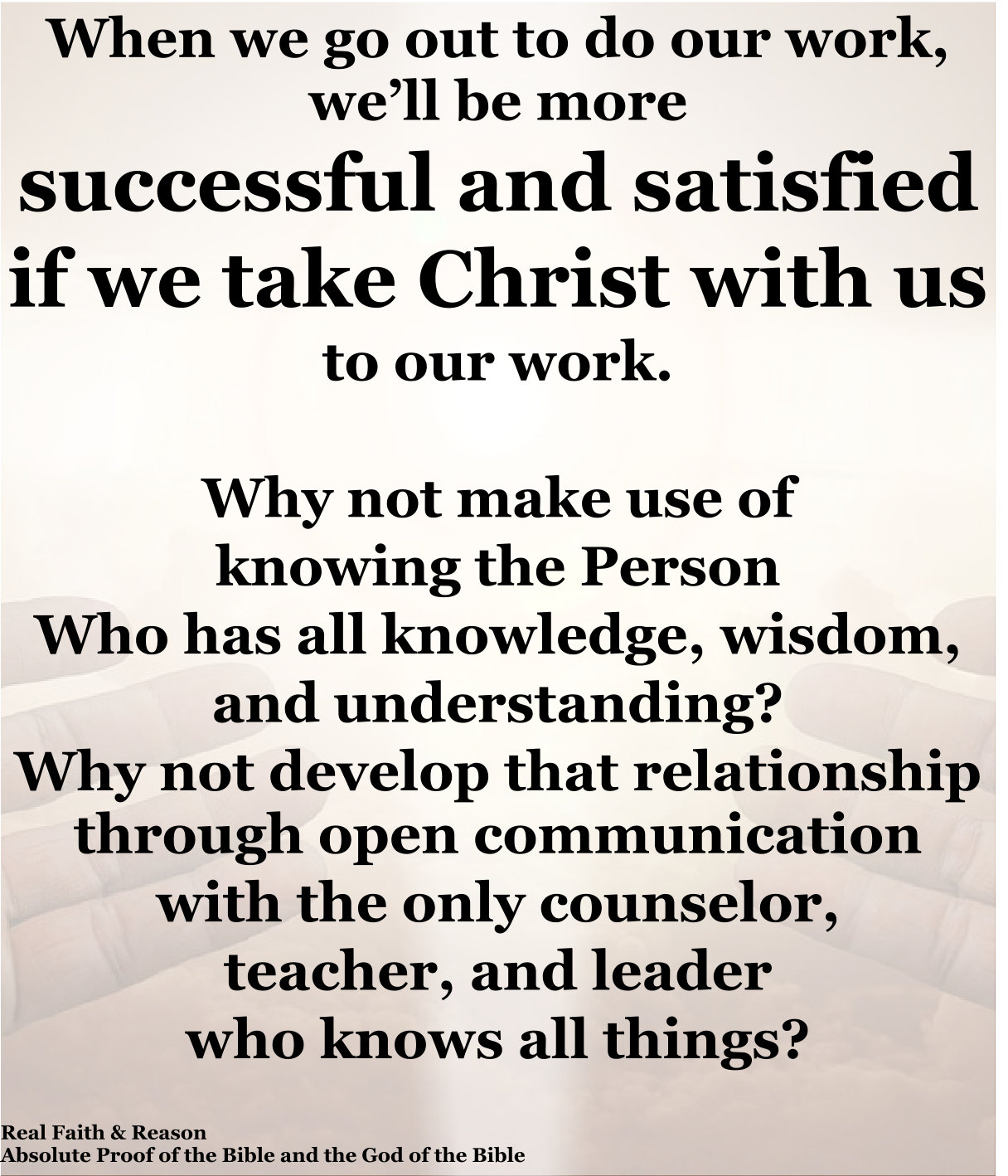When we go out to do our work, we’ll be more successful and satisfied if we take Christ with us to our work. Why not make use of knowing the Person Who has all knowledge, wisdom, and understanding? Why not develop that relationship through open communication with the only counselor, teacher, and leader who knows all things?