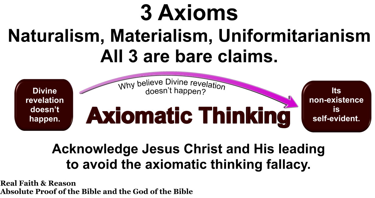 The big bang, billions of years, no Flood, and molecules to humankind stories depend on three axioms. Those axioms are naturalism, materialism, and uniformitarianism.
