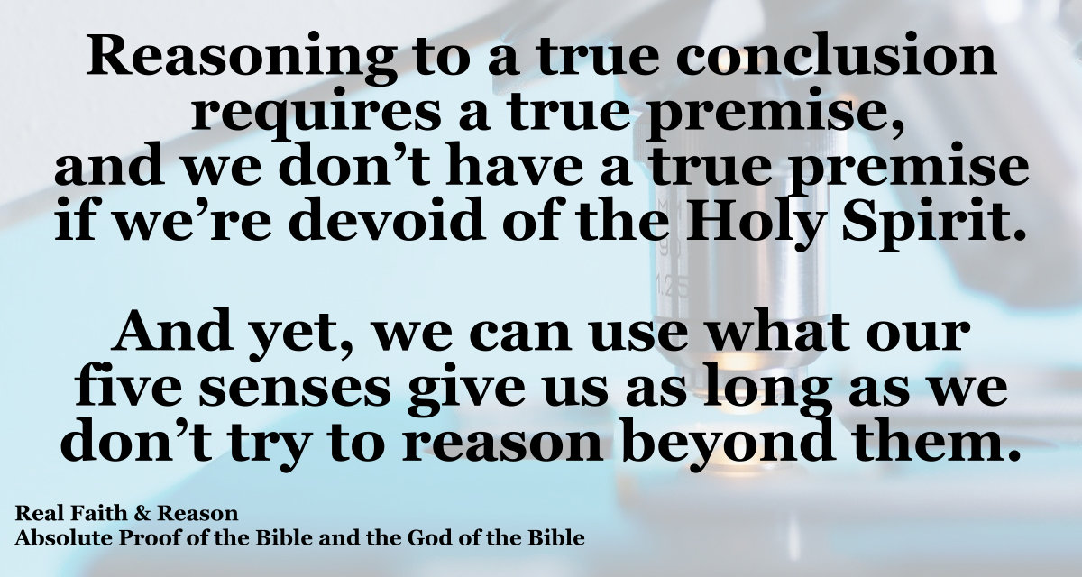 We don’t need the title “scientist” to use our sensory data. We all do it. We can say, “I tried three ways of doing my task. One of these ways works better. Therefore, I’m going to keep doing my task using the way that works better.” Some people call this “knowledge.” We could call it natural familiarity, but we don’t reason to this familiarity rationally since we never have a true premise without divine revelation. This familiarity isn’t knowledge of truth. We can use this familiarity, but we haven’t reasoned to a true conclusion. Reasoning to a true conclusion requires a true premise, and we don’t have a true premise if we’re devoid of the Holy Spirit. And yet, we can use what our five senses give us as long as we don’t try to reason beyond them.