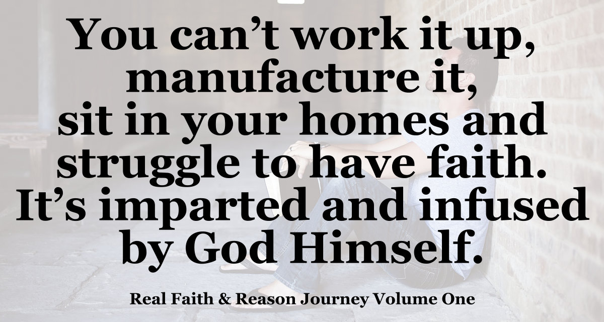 “The thing above all else I want you to see is that you can not generate it; you can not work it up; you can not manufacture it. It is imparted and infused by God Himself. You can not sit in your homes and struggle to have faith, and affirm that something is; nor can you turn your hope and desire into faith by your own power. The only place you can get it is from the Lord, for the Word clearly and distinctly states that faith is one of two things. It is either a gift of God, or it is a fruit of the Spirit.” ~ Charles S. Price, The Real Faith